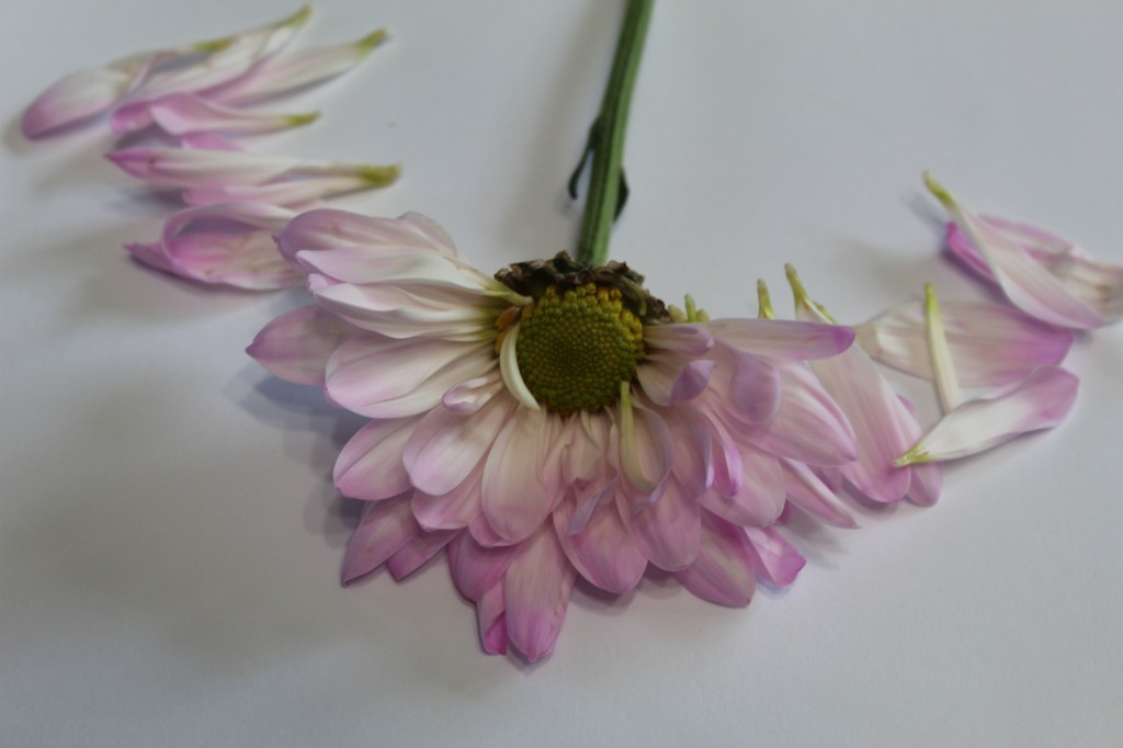 Individually, the flowers were beautiful but also flawed. As I deconstructed the setup, petals fell off, colors bled, and the white paper background became stained. When I began pulling the flowers apart and manipulating them, they resisted.