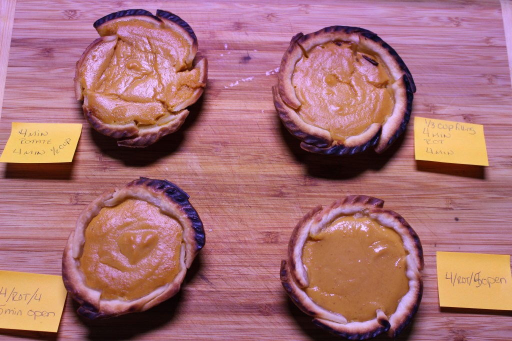 Of course, I had to give it a Pre-Thanksgiving run to see how it works. I read a lot of online reviews before firing it up, though, so I was prepared for a few of the common problems. I played around with a lot of time variations, sometimes leaving the device open for short periods in the middle of cooking and rotating the pies during the process. It took me eight pumpkin pies before I found a combination that produced a fantastic mini pie.